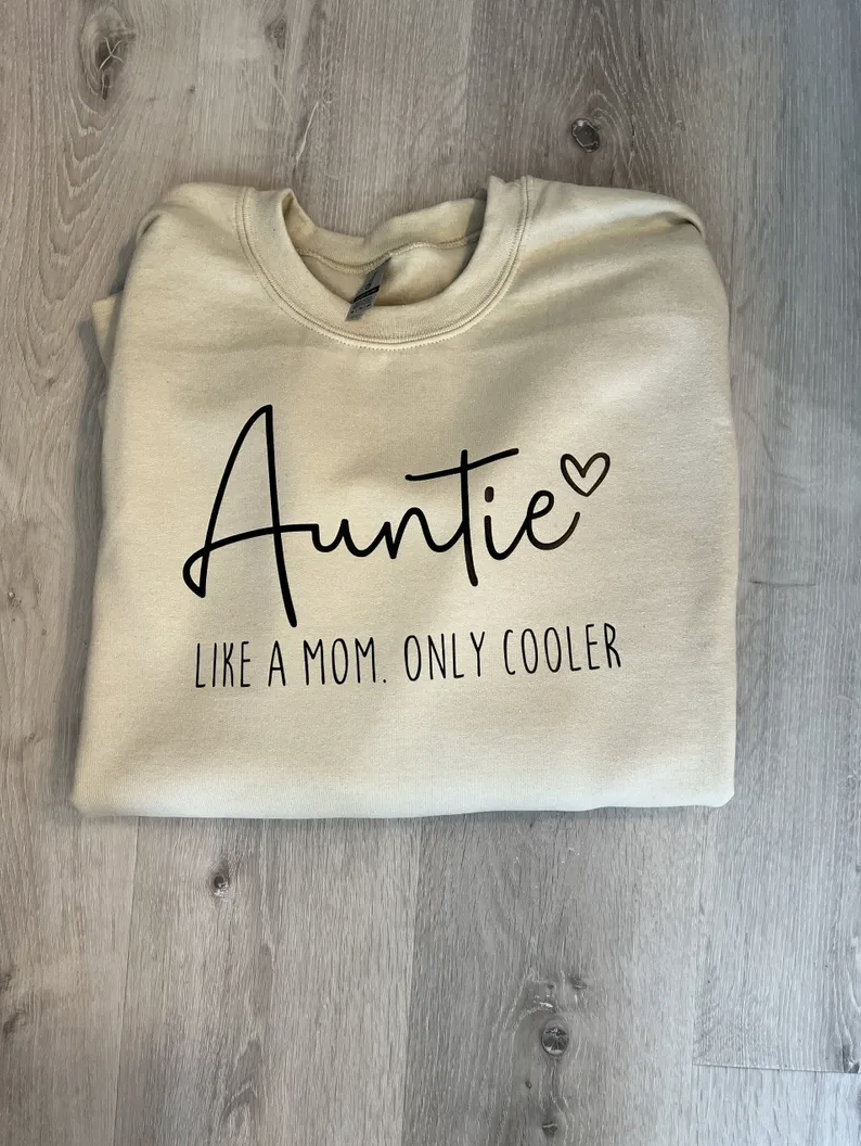 Shipping calculated at checkoutCombining comfort and style, this sweater captures the essence of cool aunties everywhere, who bring a special mix of love, fun, and fashion-forward flair. Embrace your cool auntie status with the “Auntie, Like a Mom Only Cooler” sweater, at Tsawwassen LOCALS.