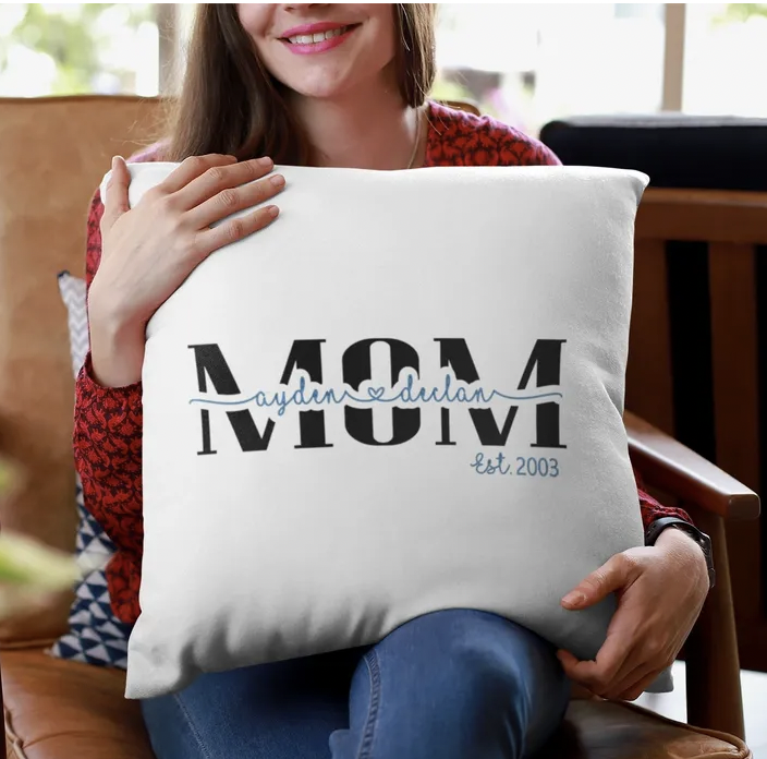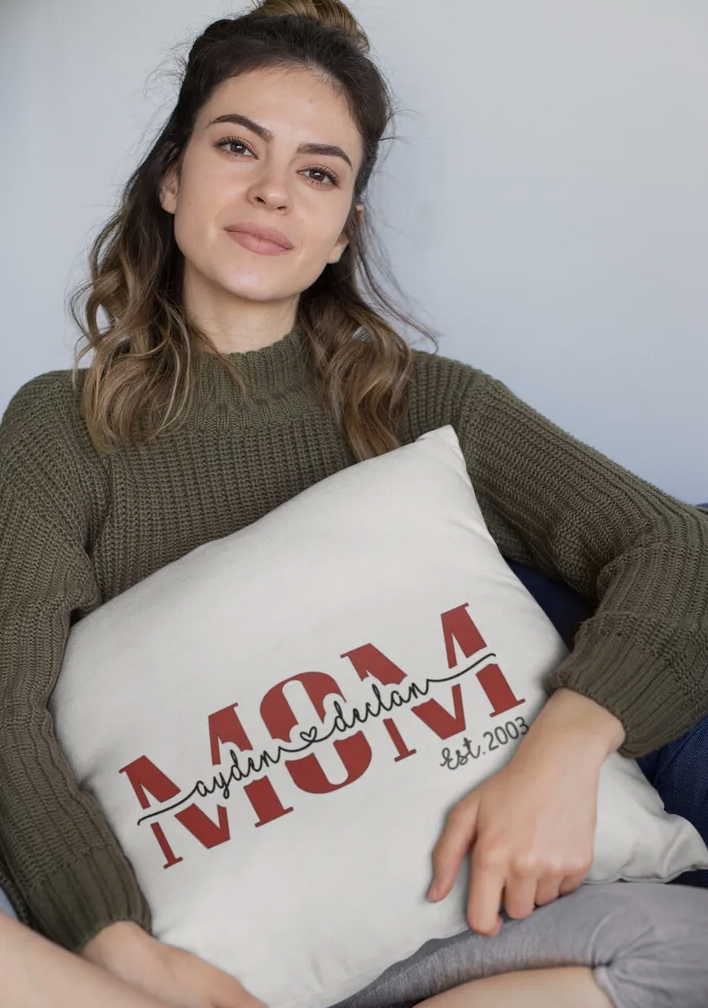Shipping calculated at checkoutIntroducing our “Customized MOM Pillow,” a personalized and cozy addition to your home decor that celebrates the special bond between a mother and her children. This pillow features the word “MOM” displayed prominently, accompanied by customizable spaces for est dates and the names of your beloved children.