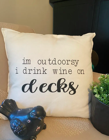 Shipping calculated at checkoutCelebrate your unique brand of outdoorsy spirit with our “I’m Outdoorsy. I Drink Wine on Decks” pillow. Whether you find your sanctuary on a picturesque deck overlooking the wilderness or a cozy backyard, this playful pillow encapsulates your love for the great outdoors and a glass of your favourite wine.