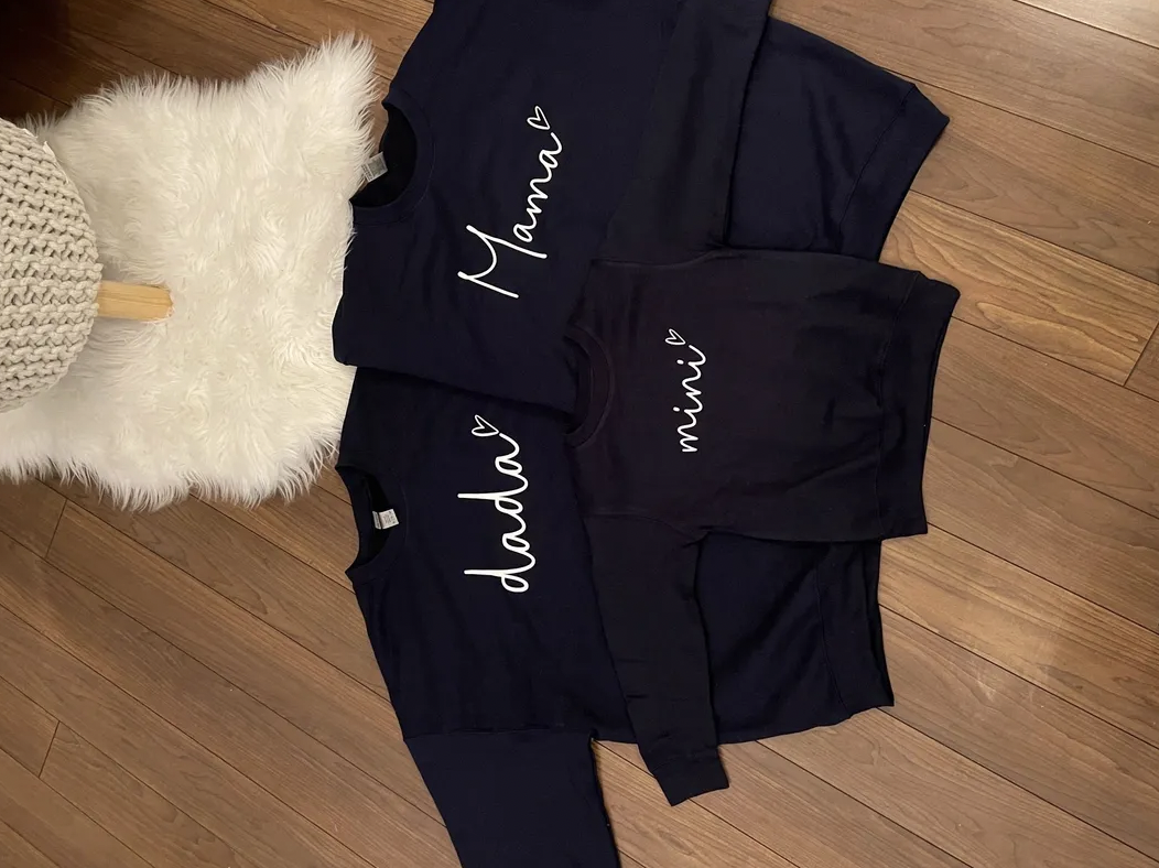 Shipping calculated at checkoutIntroducing our “Mama, Dada, Mini Crewnecks” collection, a perfect ensemble for stylish family bonding. This collection features matching crewneck sweatshirts for moms, dads, and their little ones, creating an adorable and coordinated look for the whole family. Crafted with the utmost comfort and style in mind, these crewnecks are made from premium materials to keep you cozy and fashion-forward.