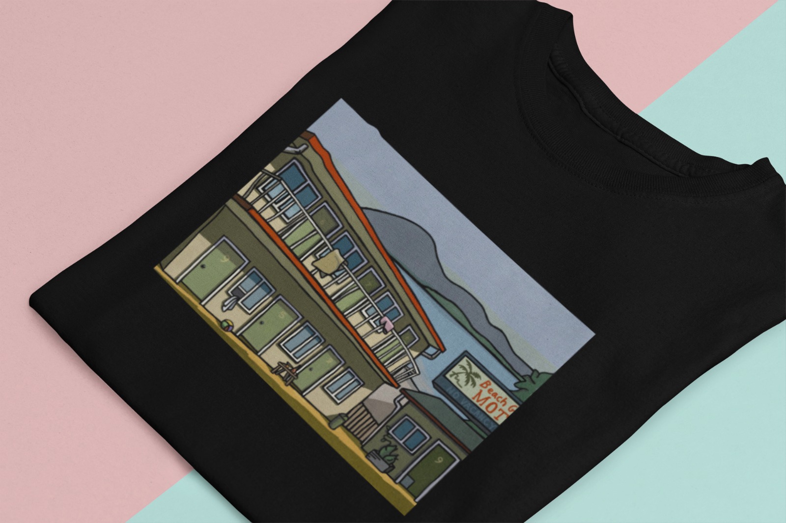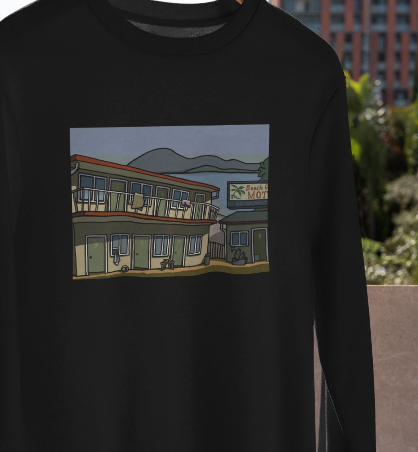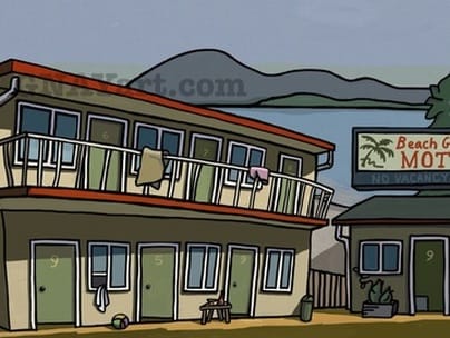 Long Hooperesque shadows kiss a local beach motel. ” You can check-out anytime you like, but you can never leave”. Is that pink champagne on ice?